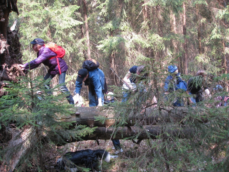 Ураган повалил огромную ёлку. Надо залезть на верхушку корневища. Это удалось лишь немногим.